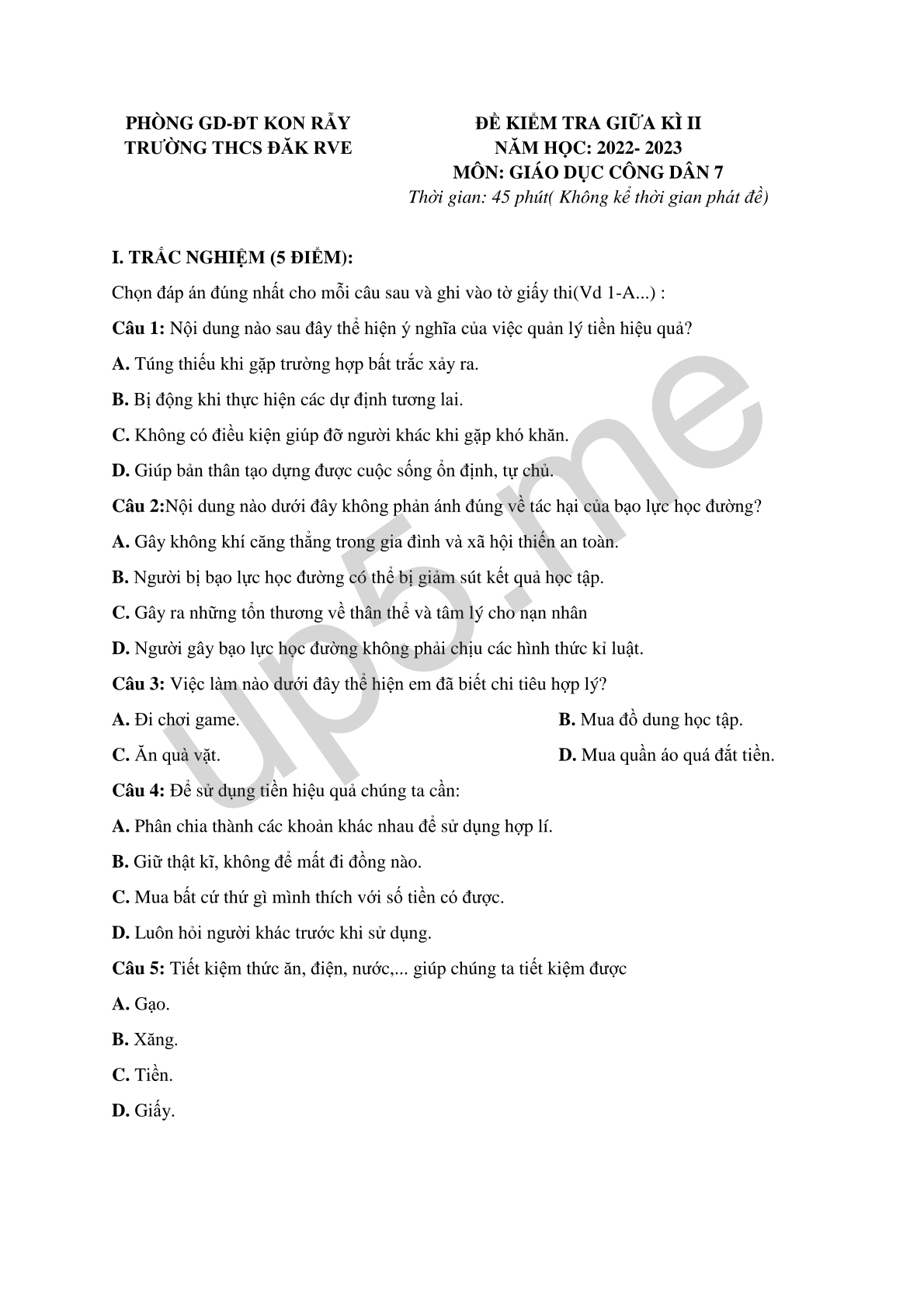ĐỀ KIỂM TRA GIỮA KÌ II NĂM HỌC: 2022- 2023 MÔN: GIÁO DỤC CÔNG DÂN 7 Thời gian: 45 phút( Không kể thời gian phát đề) |
