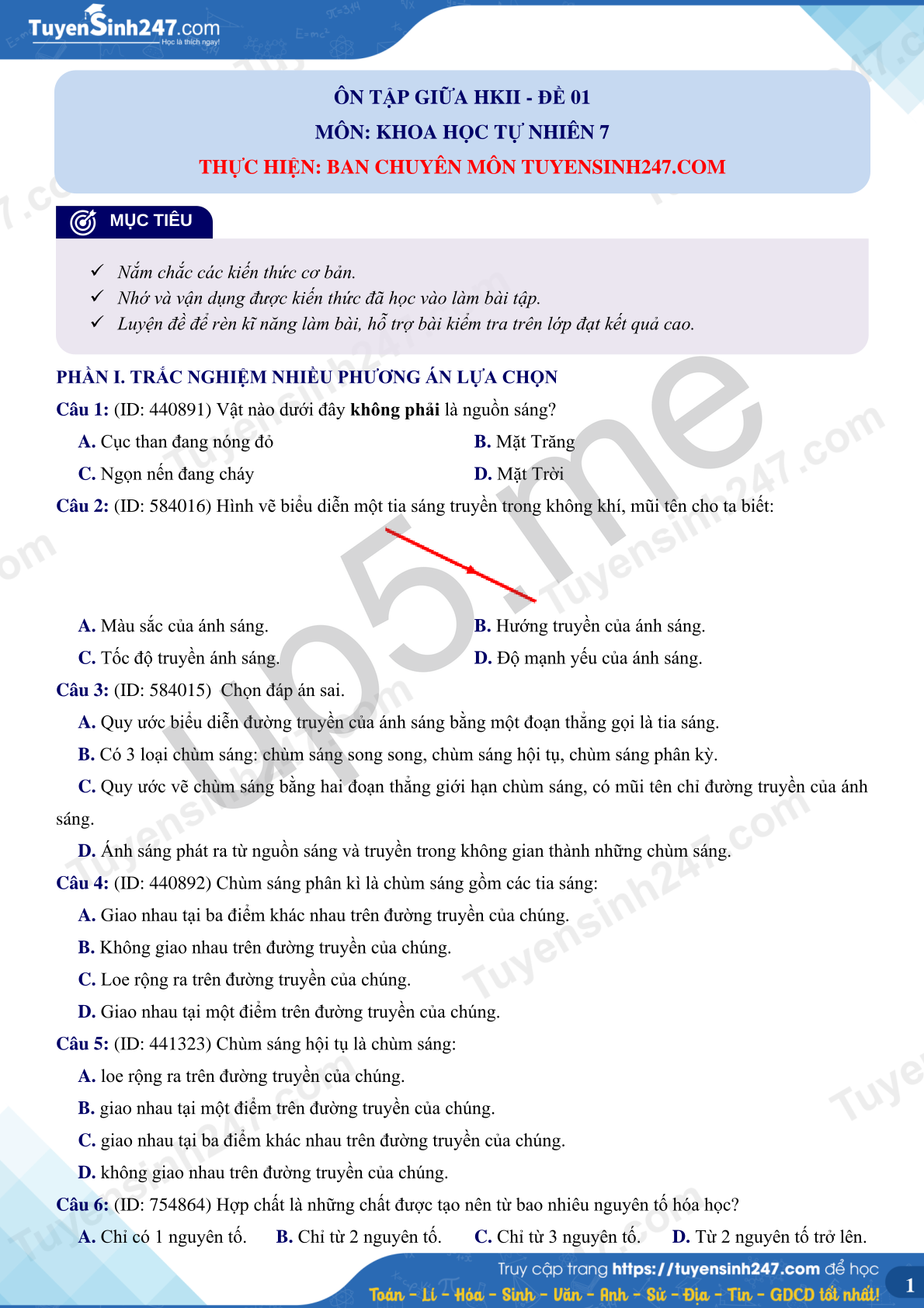 Câu 1: (ID: 440891) Vật nào dưới đây không phải là nguồn sáng?