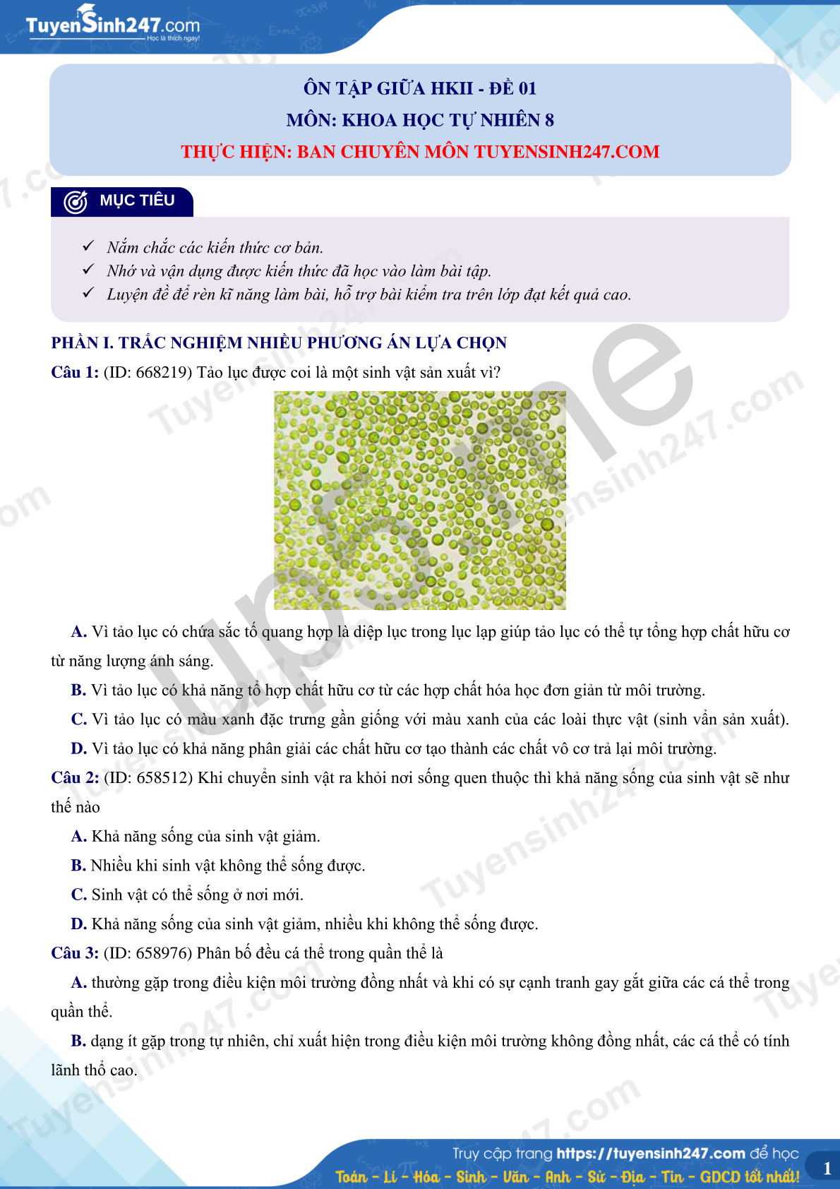Câu 1: (ID: 668219) Tảo lục được coi là một sinh vật sản xuất vì?