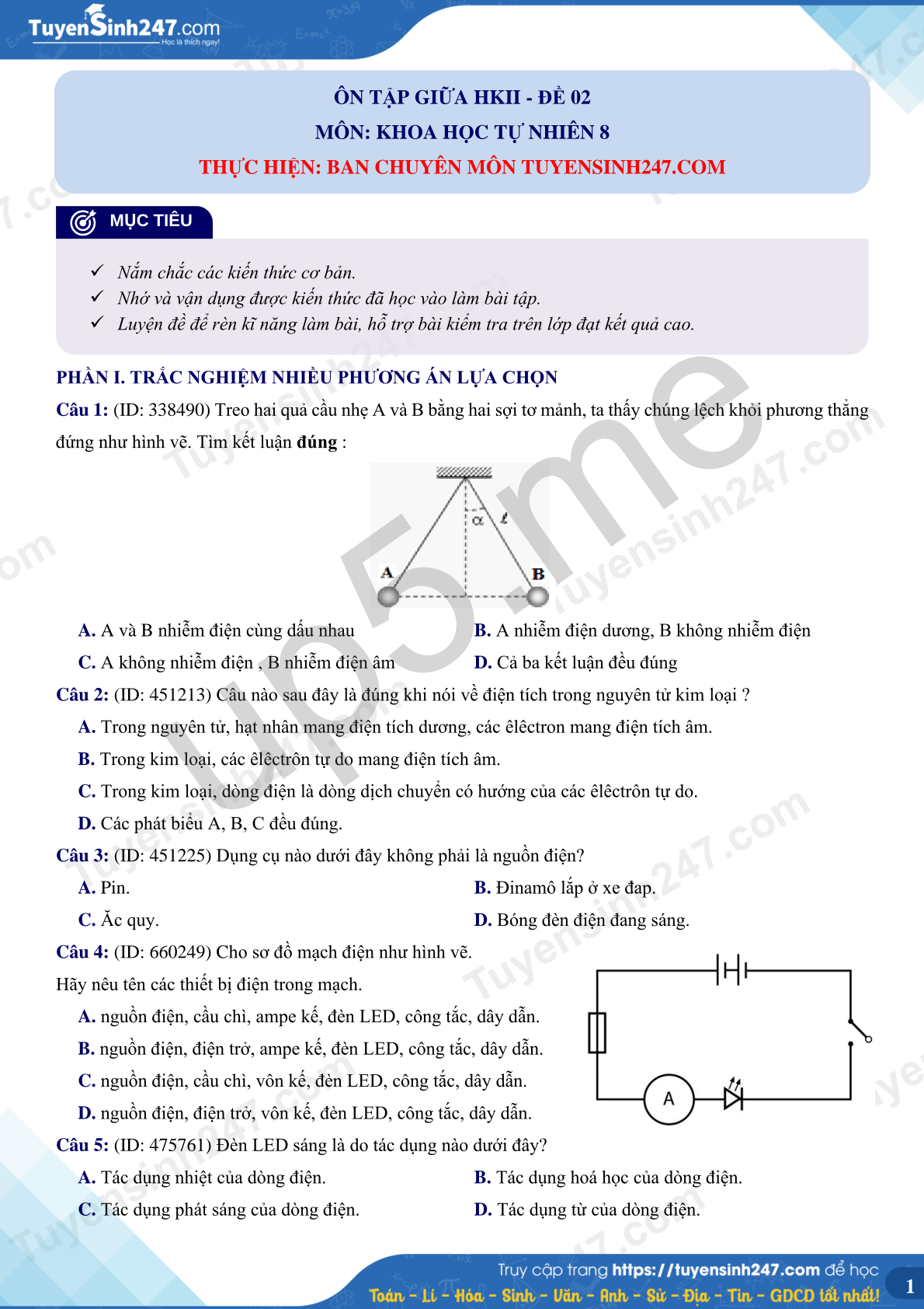 Câu 1: (ID: 338490) Treo hai quả cầu nhẹ A và B bằng hai sợi tơ mảnh, ta thấy chúng lệch khỏi phương thẳng đứng như hình vẽ. Tìm kết luận đúng :