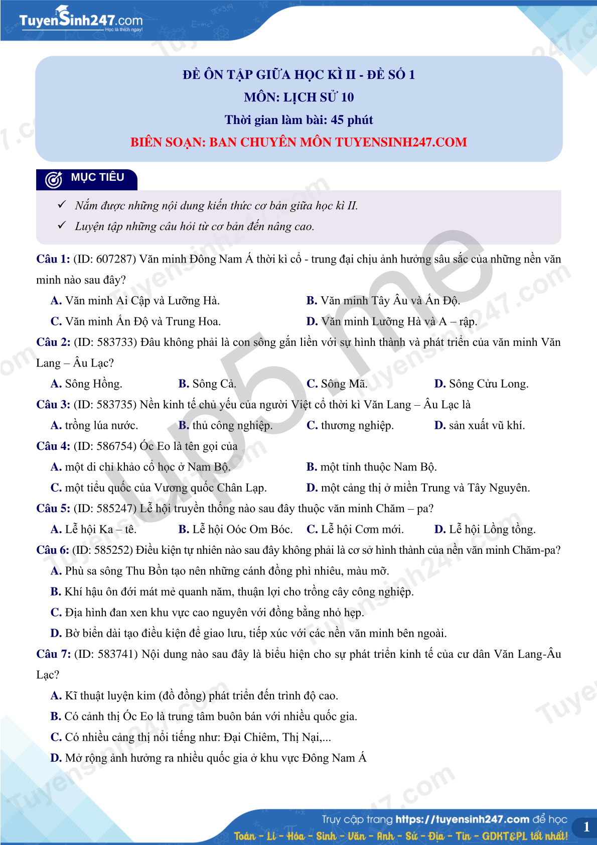 A. Sông Hồng. B. Sông Cả. C. Sông Mã. D. Sông Cửu Long. Câu 3: (ID: 583735) Nền kinh tế chủ yếu của người Việt cổ thời kì Văn Lang – Âu Lạc là