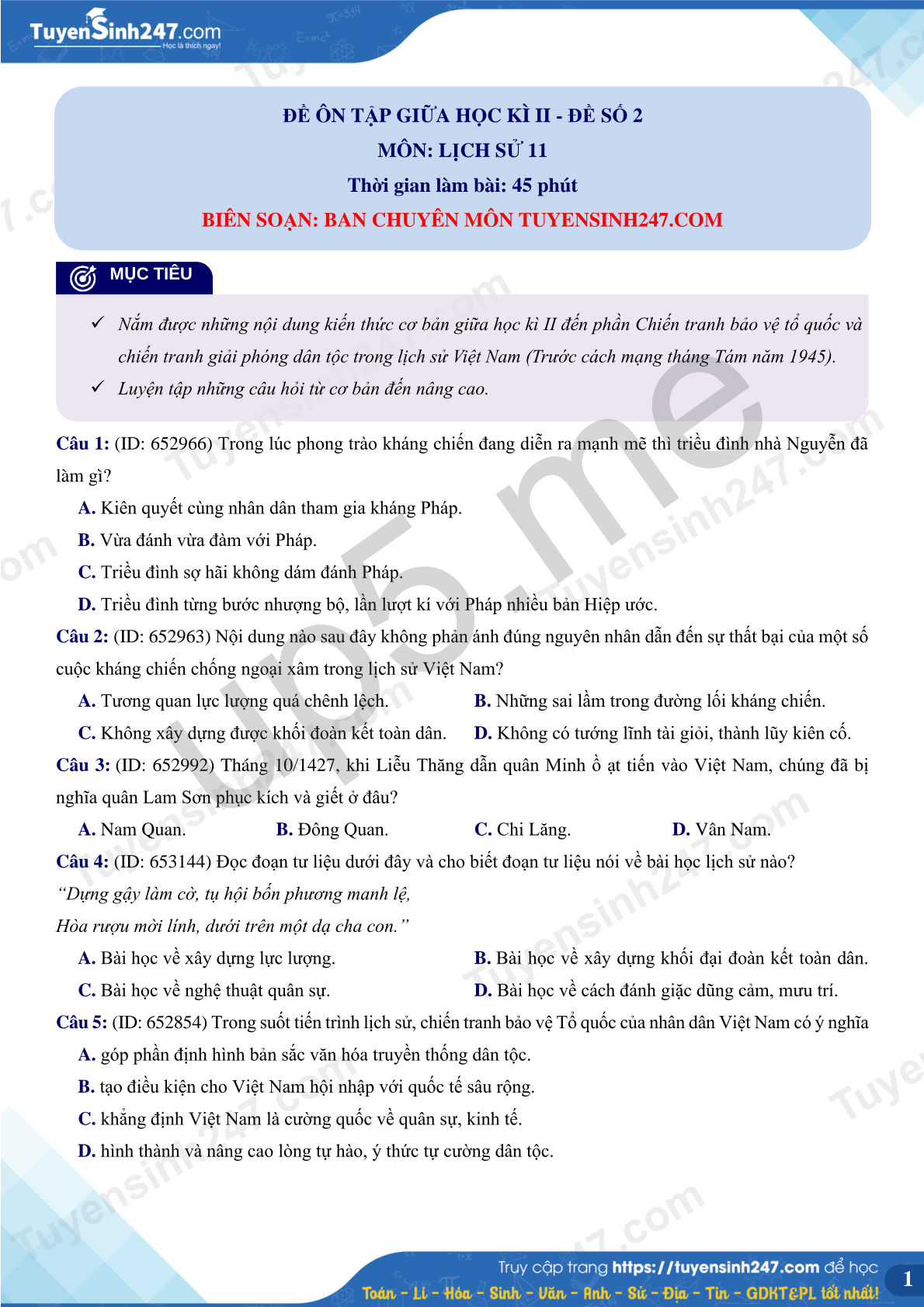 Câu 2: (ID: 652963) Nội dung nào sau đây không phản ánh đúng nguyên nhân dẫn đến sự thất bại của một số cuộc kháng chiến chống ngoại xâm trong lịch sử Việt Nam?