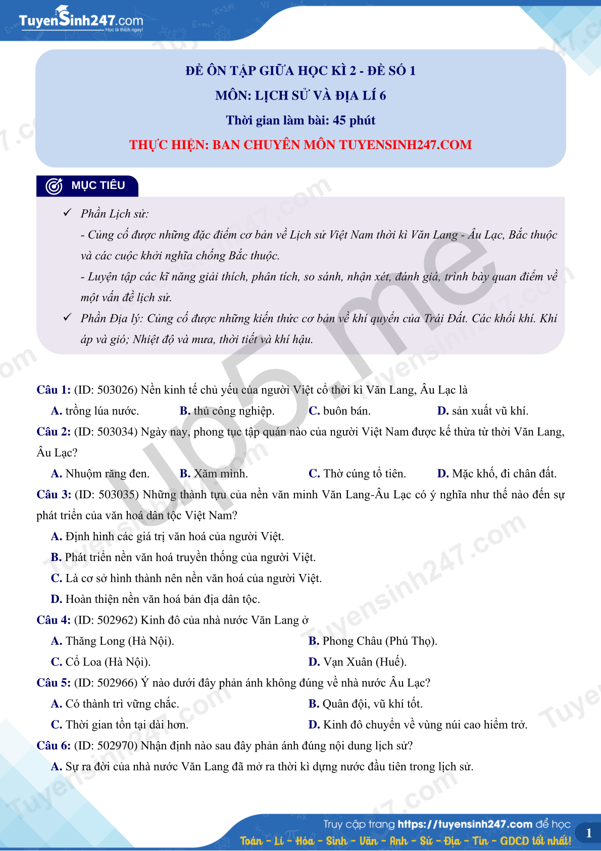 MÔN: LỊCH SỬ VÀ ĐỊA LÍ 6