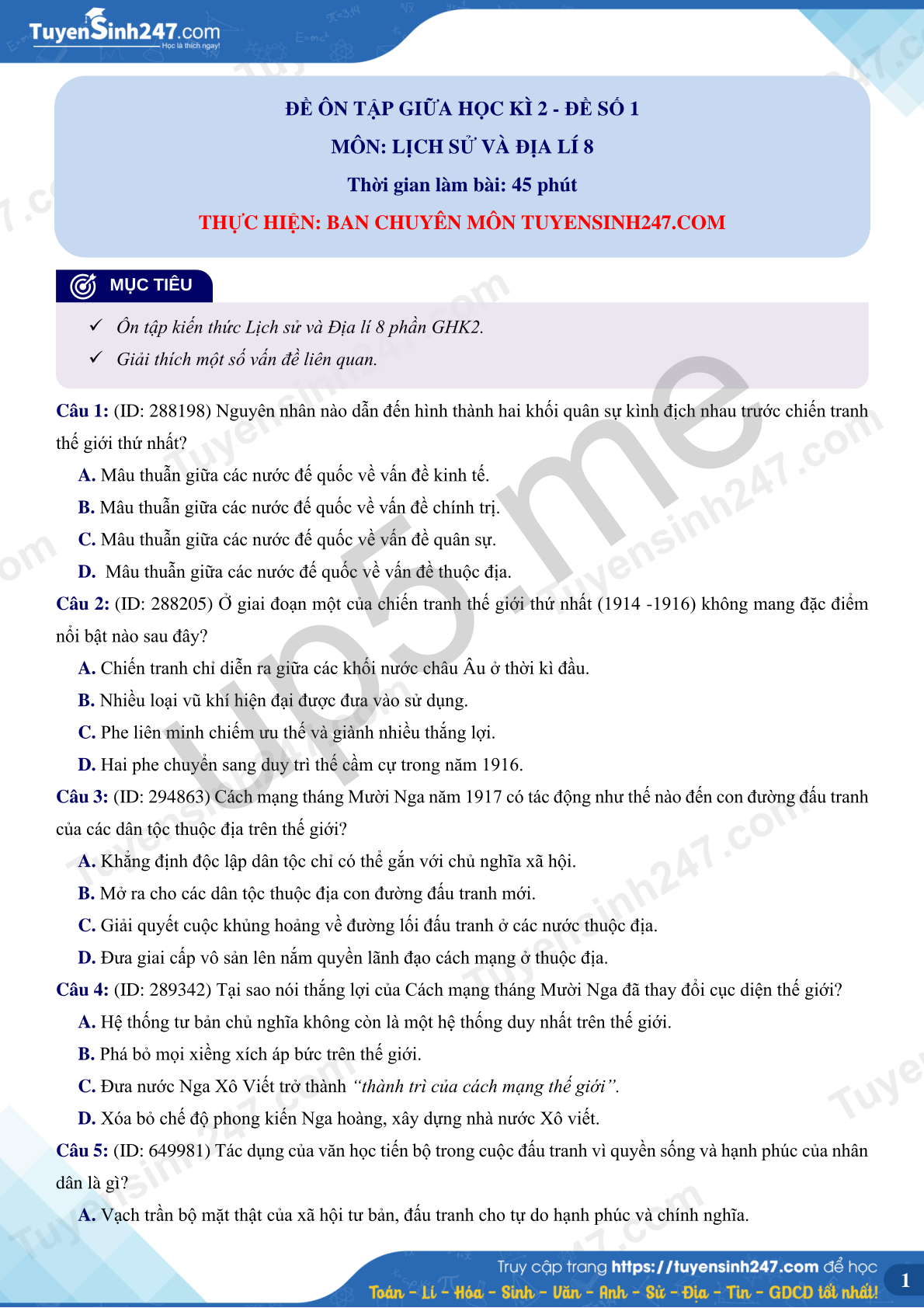 Câu 1: (ID: 288198) Nguyên nhân nào dẫn đến hình thành hai khối quân sự kình địch nhau trước chiến tranh thế giới thứ nhất?