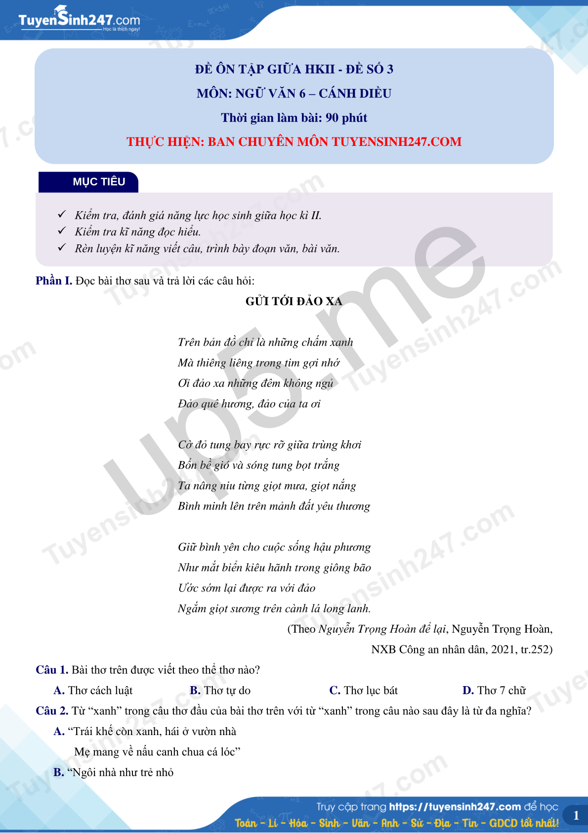 Phần I. Đọc bài thơ sau và trả lời các câu hỏi: