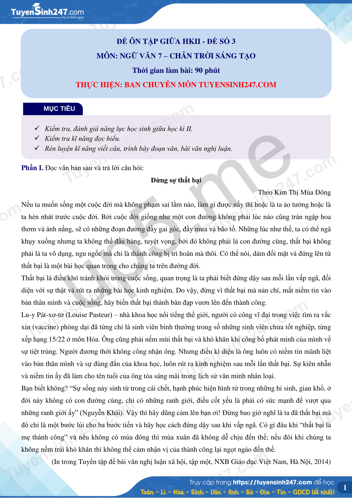 MÔN: NGỮ VĂN 7 – CHÂN TRỜI SÁNG TẠO
