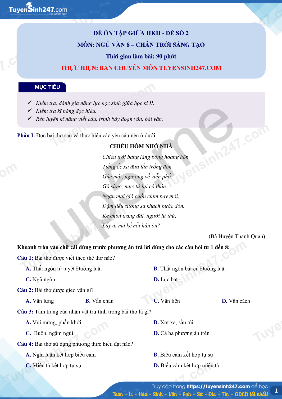 Khoanh tròn vào chữ cái đứng trước phương án trả lời đúng cho các câu hỏi từ 1 đến 8: