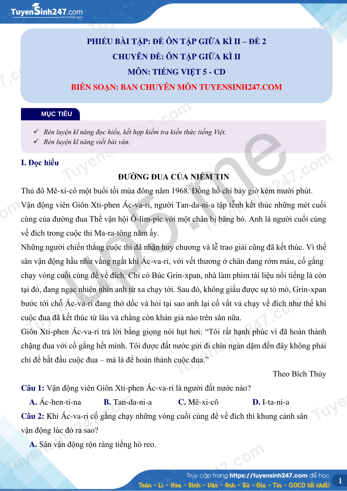 PHIẾU BÀI TẬP: ĐỀ ÔN TẬP GIỮA KÌ II – ĐỀ 2