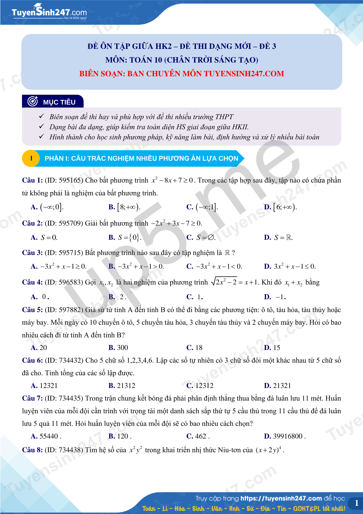 ĐỀ ÔN TẬP GIỮA HK2 – ĐỀ THI DẠNG MỚI – ĐỀ 3
