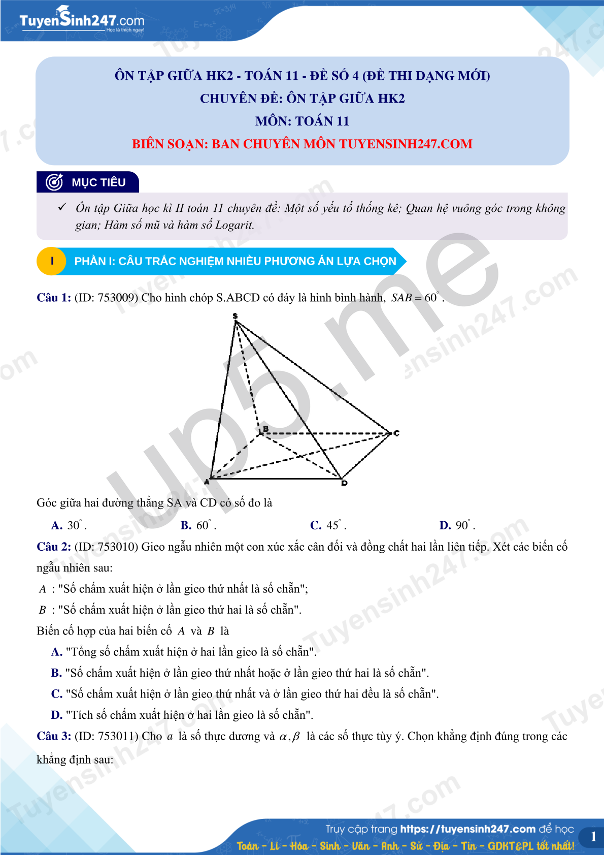 ÔN TẬP GIỮA HK2 - TOÁN 11 - ĐỀ SỐ 4 (ĐỀ THI DẠNG MỚI)