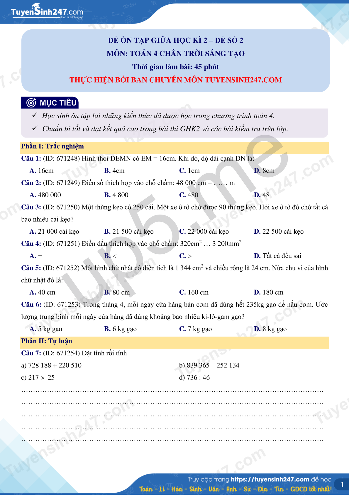 MÔN: TOÁN 4 CHÂN TRỜI SÁNG TẠO
