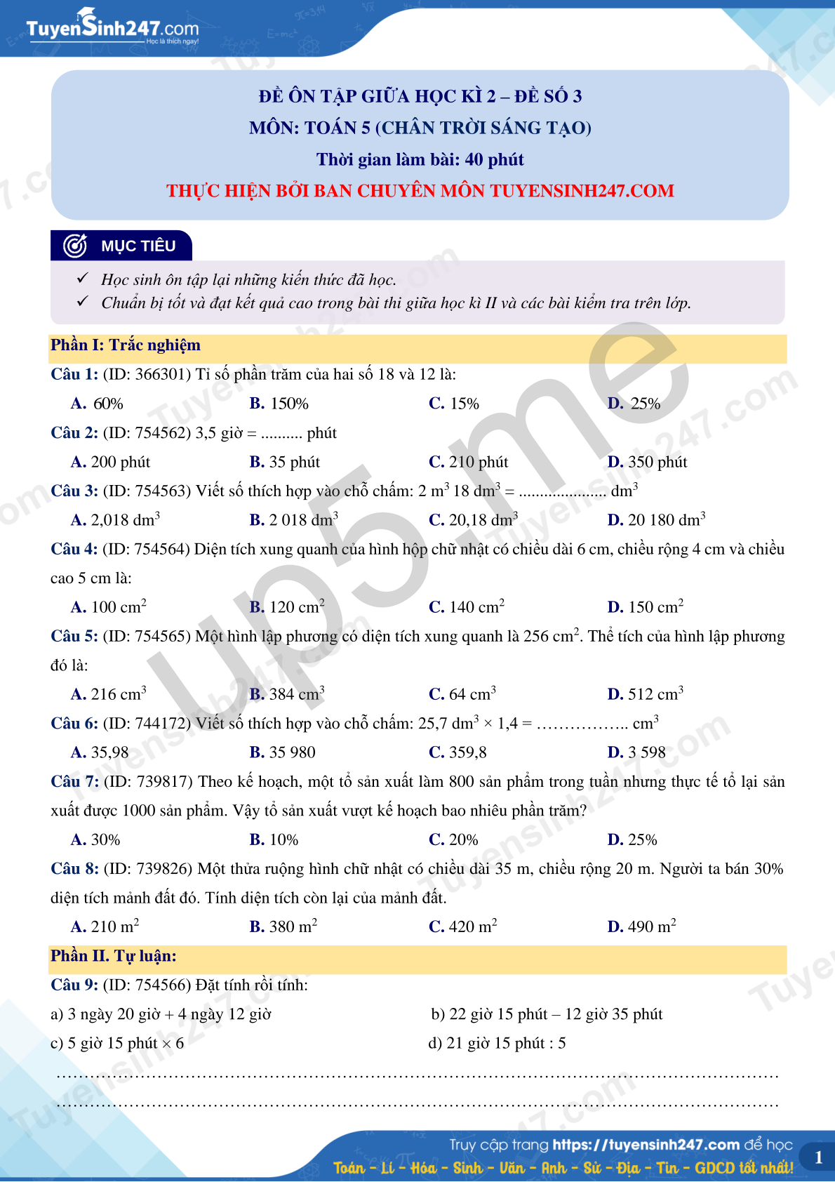 MÔN: TOÁN 5 (CHÂN TRỜI SÁNG TẠO)