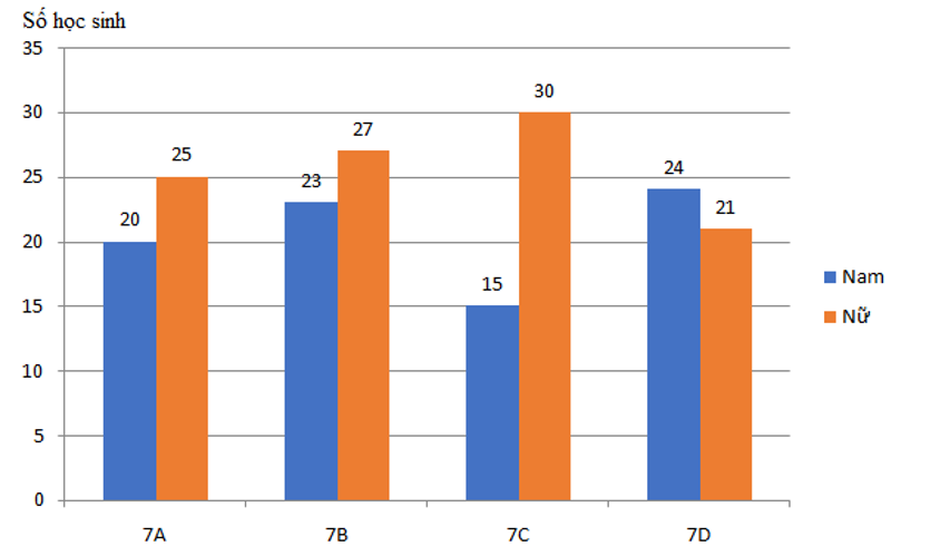 Câu 1: (ID: 595773) Khối lớp 7 trường THCS Hùng Vương có 4 lớp 7A, 7B, 7C và 7D, mỗi lớp có 45 học sinh. Bạn Minh lập biểu đồ cột kép (hình vẽ) biểu diễn số lượng học sinh nữ và học sinh nam của từng lớp.