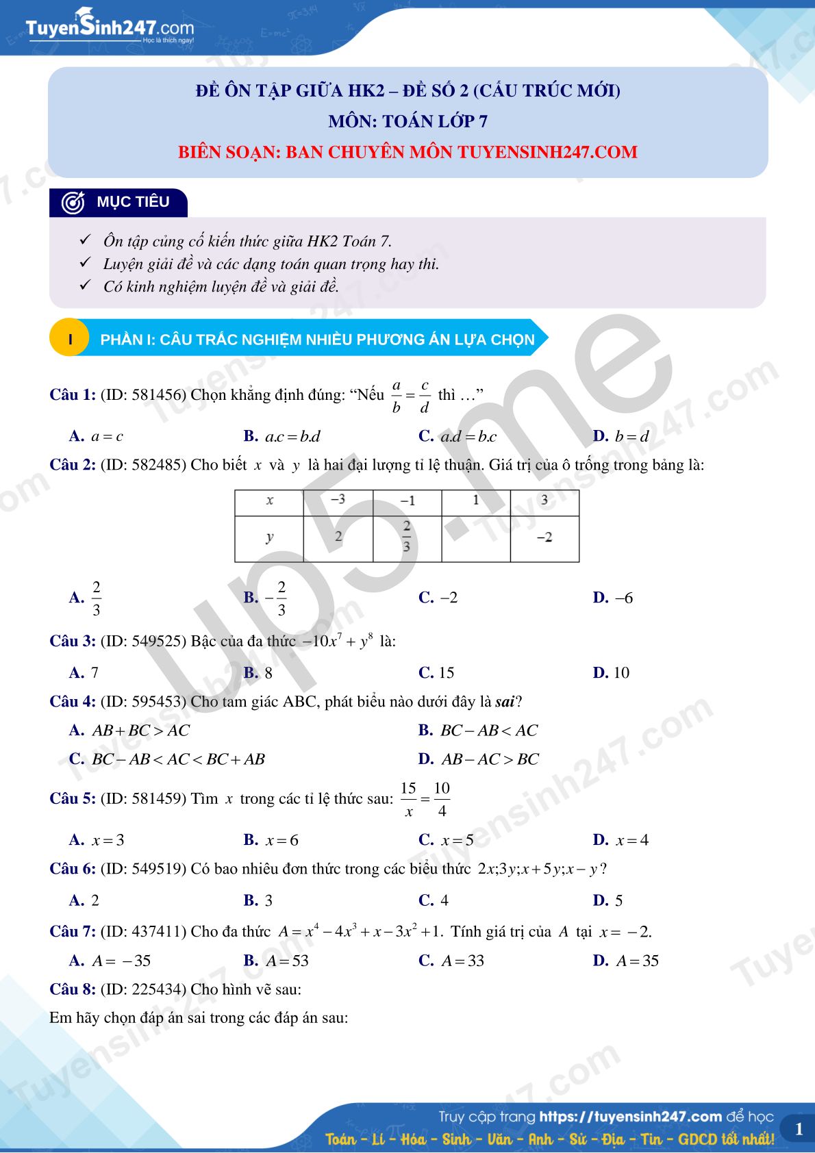 ĐỀ ÔN TẬP GIỮA HK2 – ĐỀ SỐ 2 (CẤU TRÚC MỚI)