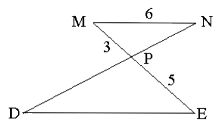 Câu 2: (ID: 668737) Cho hình vẽ, biết $\text{MN}//\text{DE},\text{MN} = 6\mspace{6mu}\text{cm}$, $\text{MP} = 3\mspace{6mu}\text{cm},\text{PE} = 5\mspace{6mu}\text{cm}$. Độ dài đoạn thẳng $\text{DE}$ là: