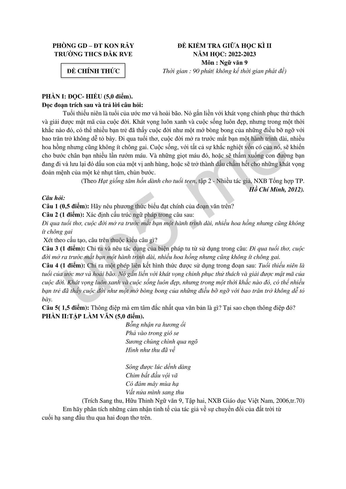 TRƯỜNG THCS ĐĂK RVEĐỀ CHÍNH THỨC