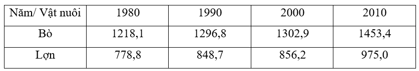 Câu 1: (ID: 660659) Bảng số liệu sau đây biểu thị số lượng đàn bò và đàn lợn trên thế giới giai đoạn 1980 - 2014 (đơn vị: triệu con)
