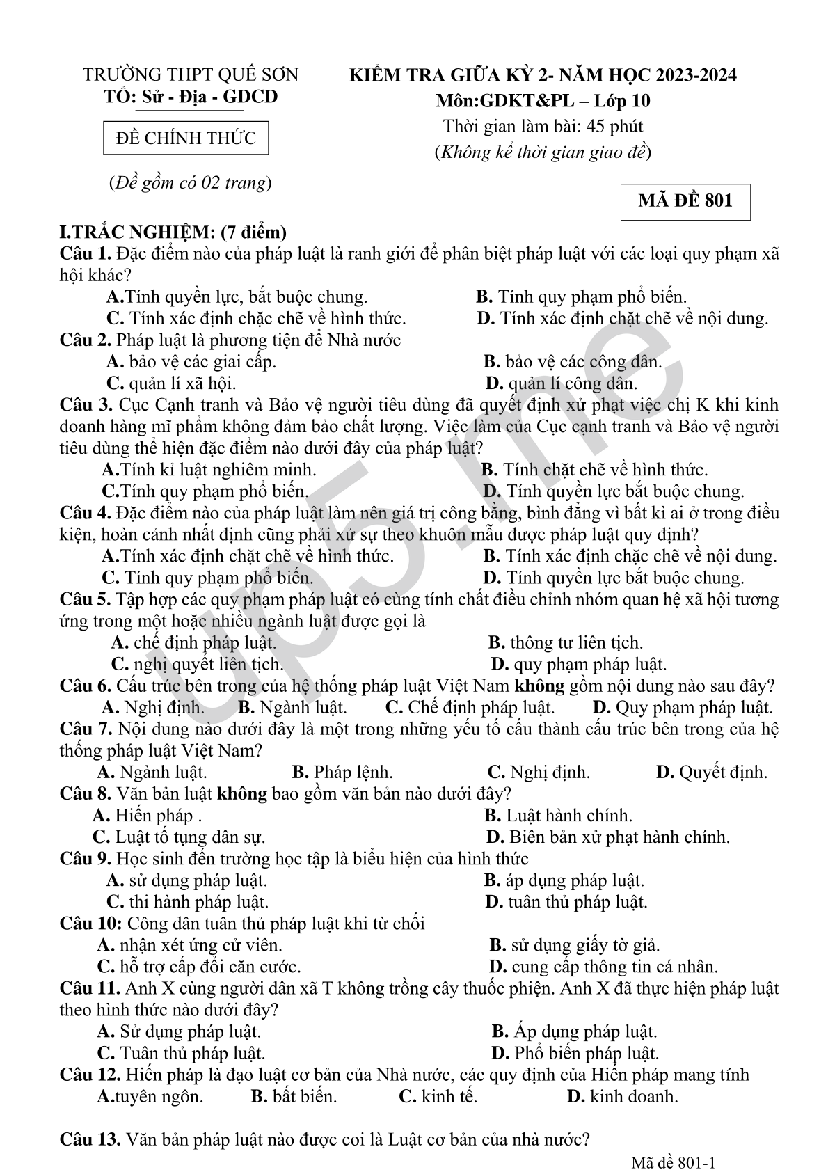 TRƯỜNG THPT QUẾ SƠN TỔ: Sử - Địa - GDCD ĐỀ CHÍNH THỨC (Đề gồm có 02 trang) |