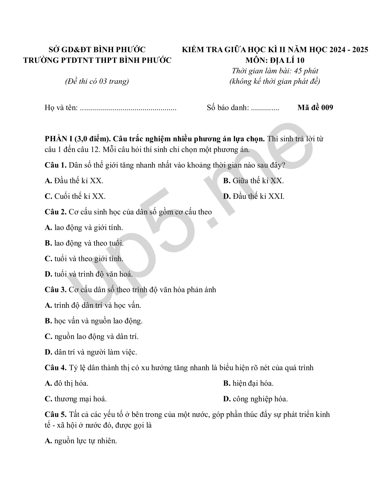 | SỞ GD&ĐT BÌNH PHƯỚC TRƯỜNG PTDTNT THPT BÌNH PHƯỚC(Đề thi có 03 trang) | KIỂM TRA GIỮA HỌC KÌ II NĂM HỌC 2024 - 2025MÔN: ĐỊA LÍ 10Thời gian làm bài: 45 phút (không kể thời gian phát đề) |