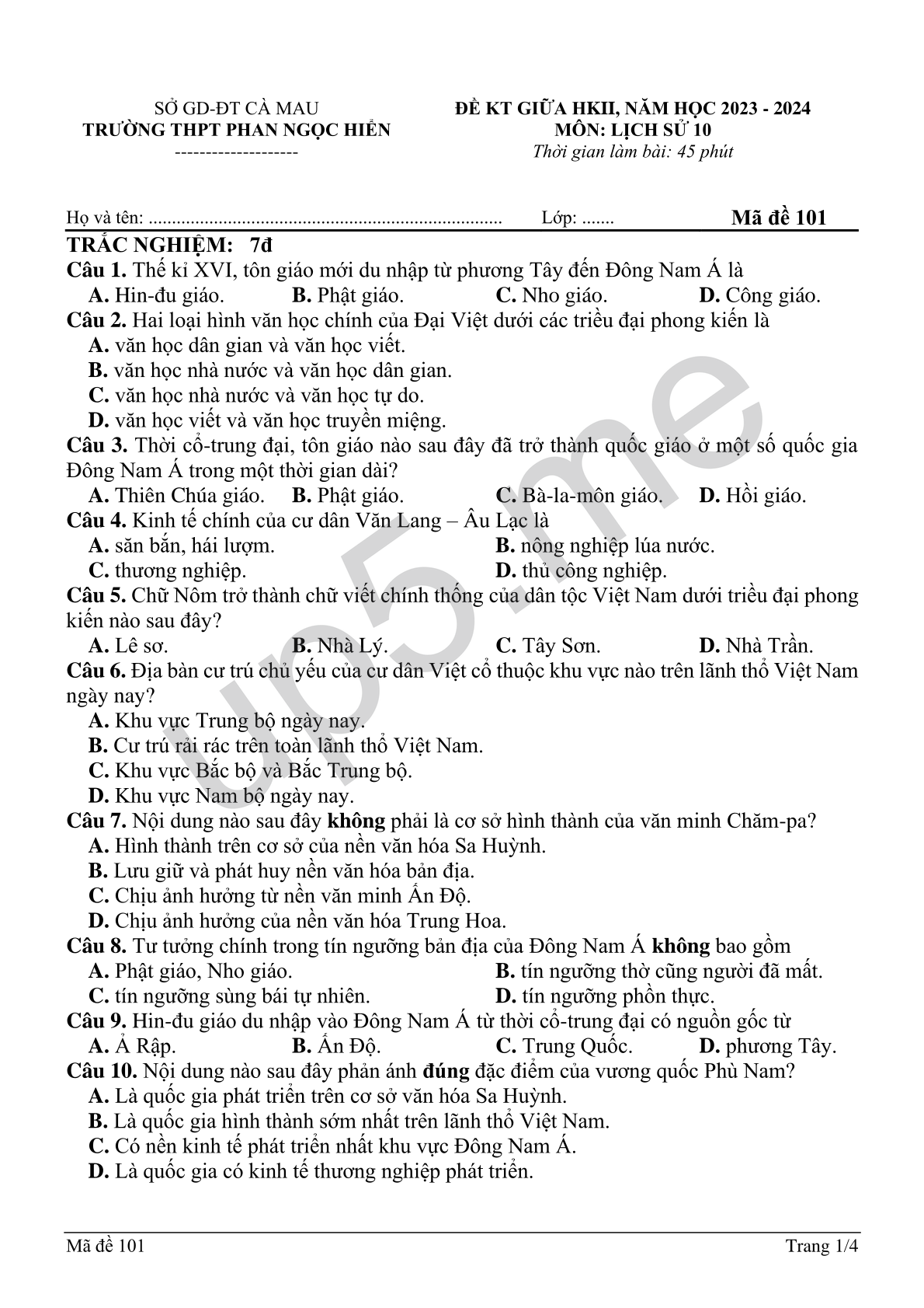 ĐỀ KT GIỮA HKII, NĂM HỌC 2023 - 2024 MÔN: LỊCH SỬ 10 Thời gian làm bài: 45 phút |