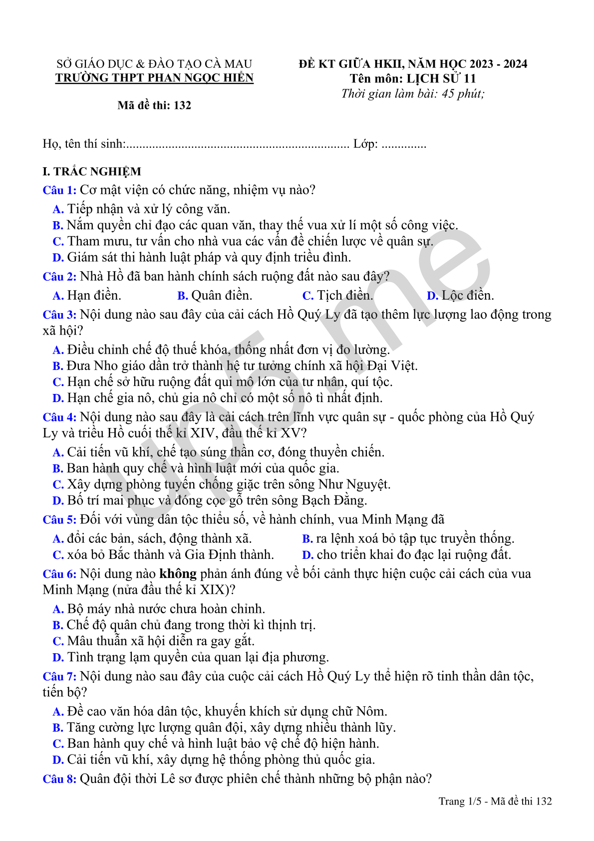 SỞ GIÁO DỤC & ĐÀO TẠO CÀ MAU TRƯỜNG THPT PHAN NGỌC HIỂN Mã đề thi: 132 |