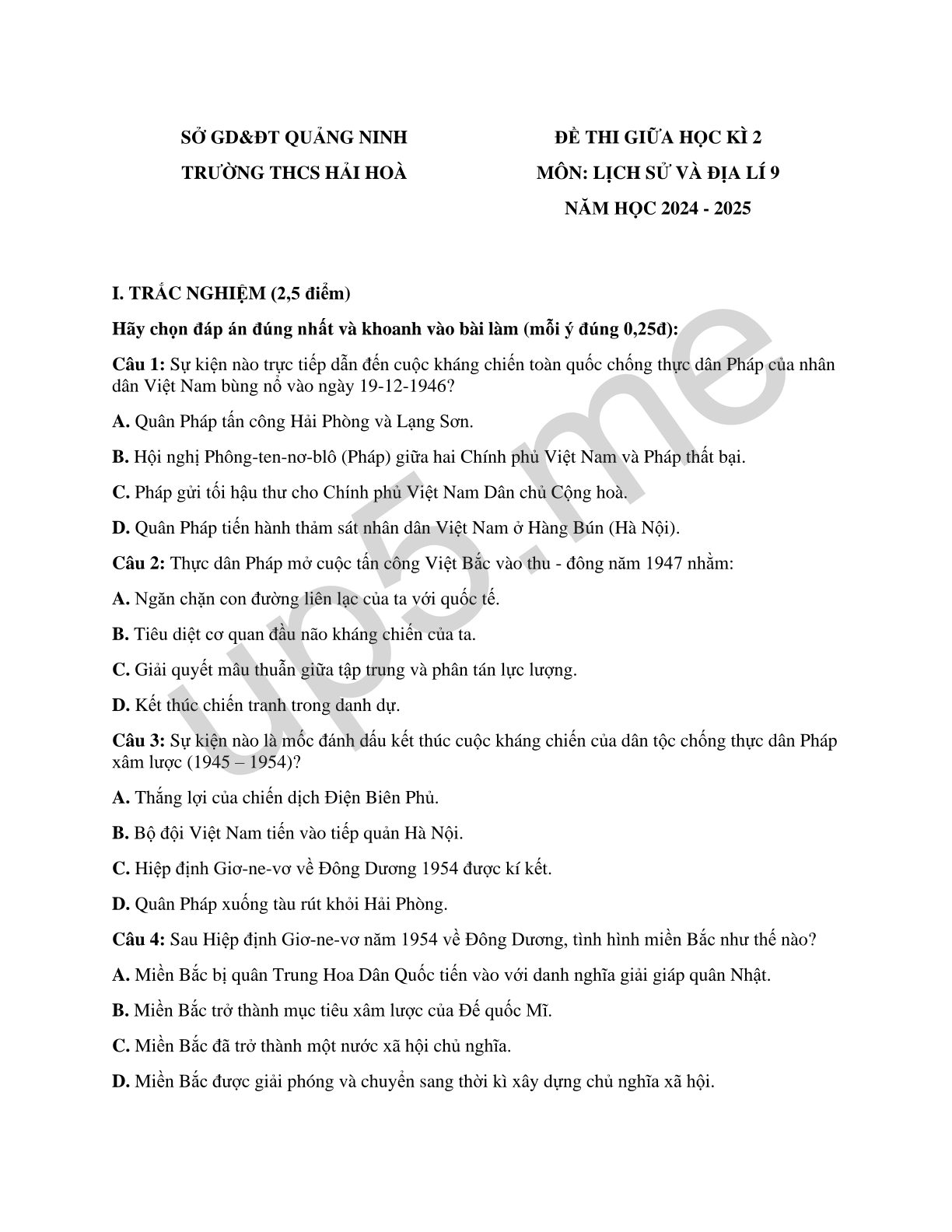 ĐỀ THI GIỮA HỌC KÌ 2MÔN: LỊCH SỬ VÀ ĐỊA LÍ 9NĂM HỌC 2024 - 2025 |