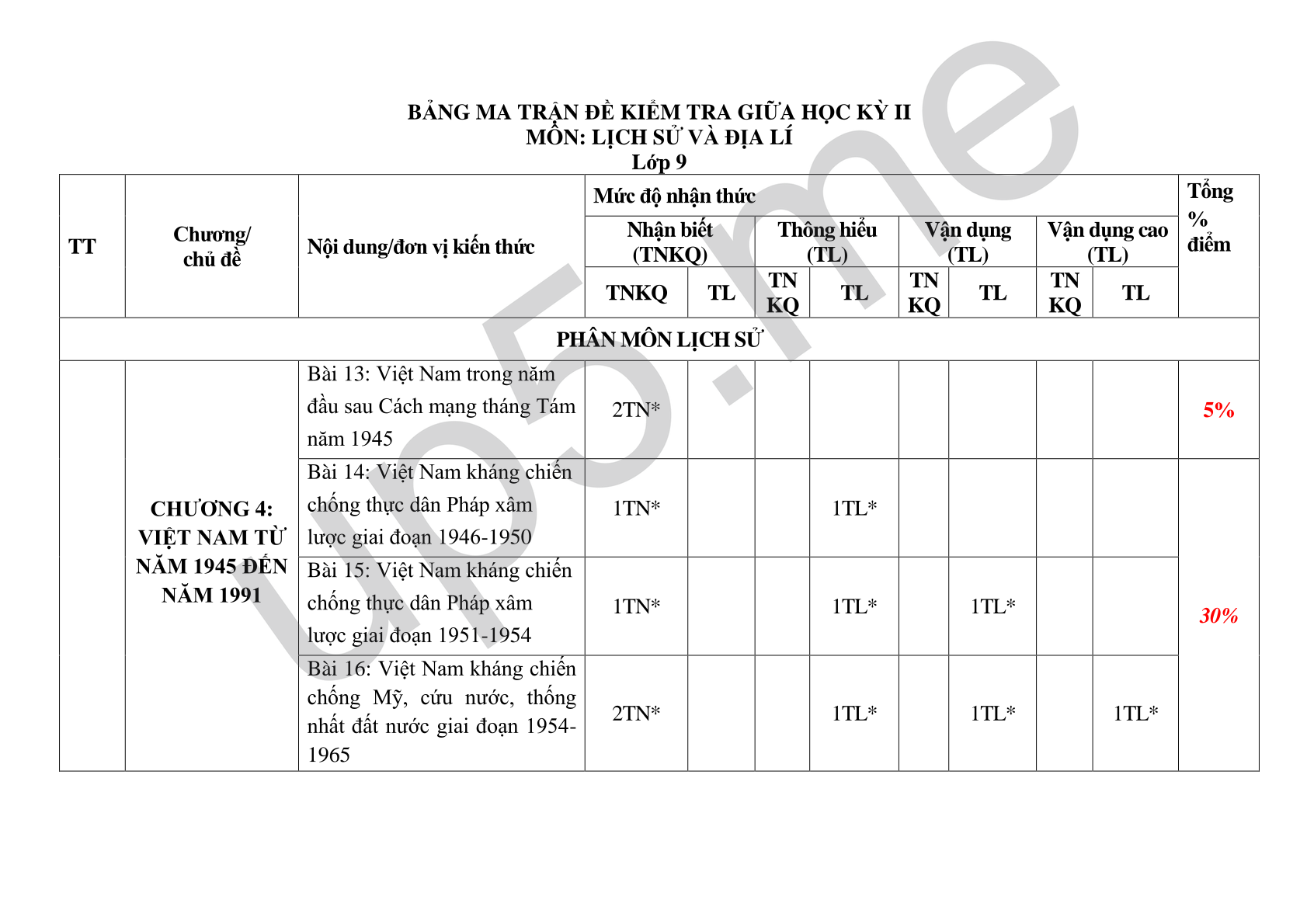 | Bài 14: Việt Nam kháng chiến chống thực dân Pháp xâm lược giai đoạn 1946-1950 | 1TN* | 1TL* | 30% | ||||||||