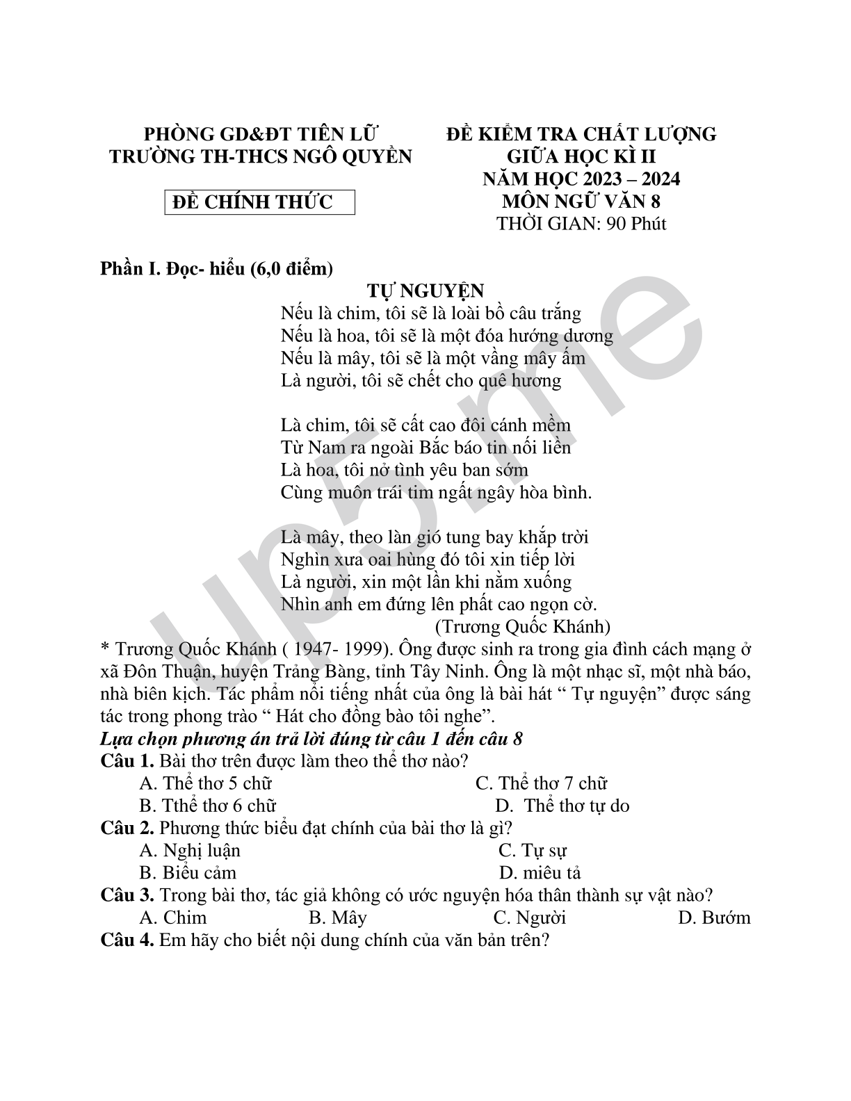ĐỀ KIỂM TRA CHẤT LƯỢNG GIỮA HỌC KÌ II NĂM HỌC 2023 – 2024 MÔN NGỮ VĂN 8 THỜI GIAN: 90 Phút |