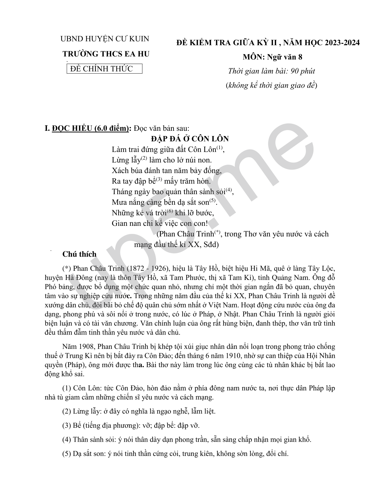 ĐỀ KIỂM TRA GIỮA KỲ II , NĂM HỌC 2023-2024 MÔN: Ngữ văn 8 Thời gian làm bài: 90 phút(không kể thời gian giao đề) |