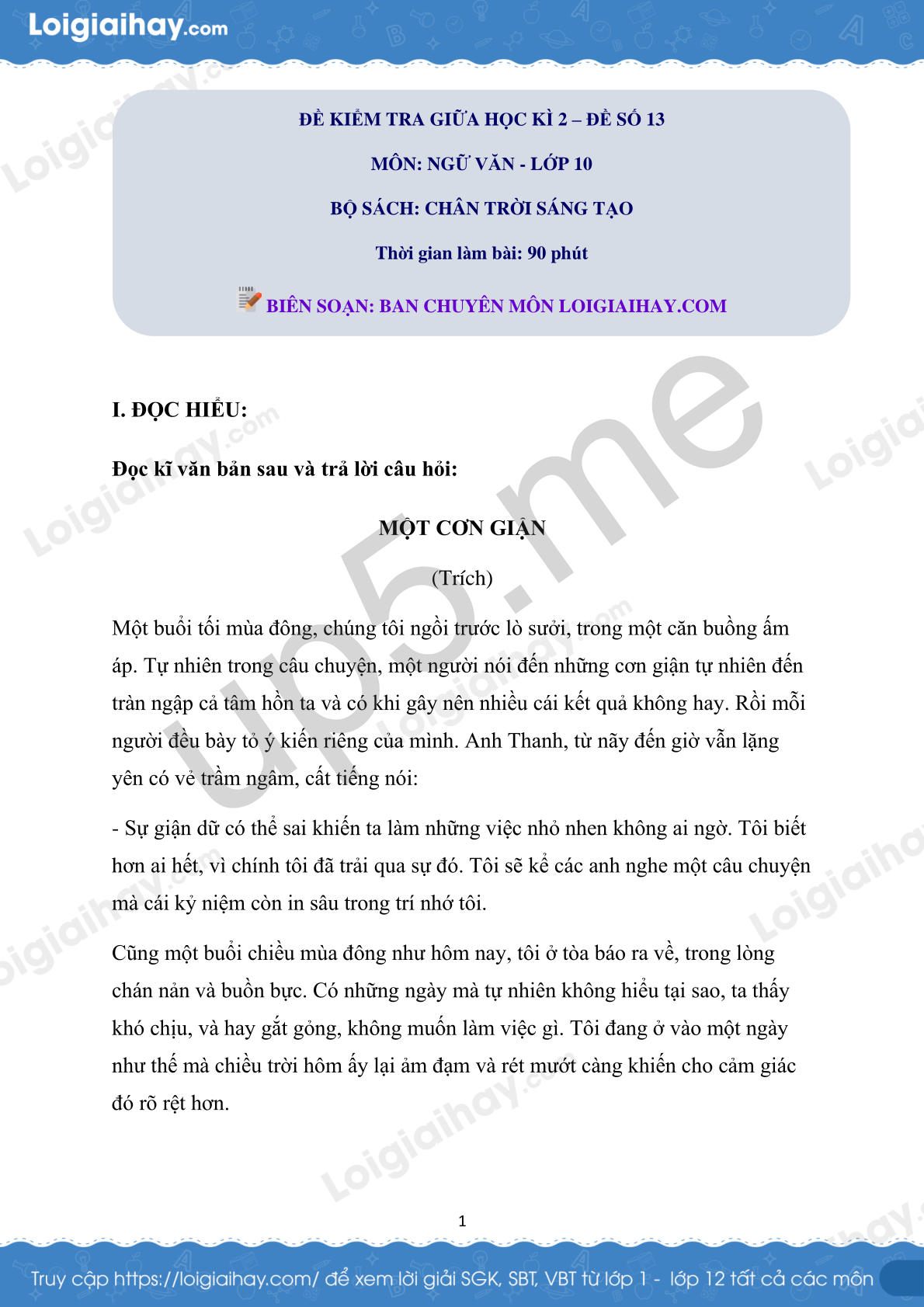 I. ĐỌC HIỂU:
