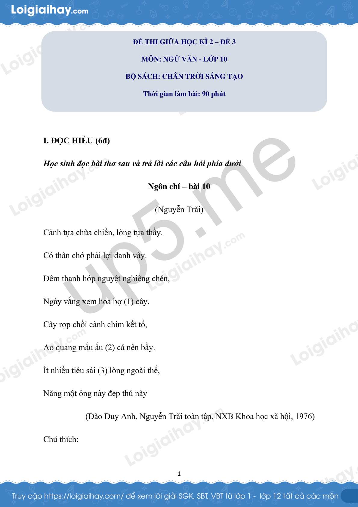 Câu 1: Bài thơ Ngôn chí 10 thuộc sáng tác nào sau đây của Nguyễn Trãi?