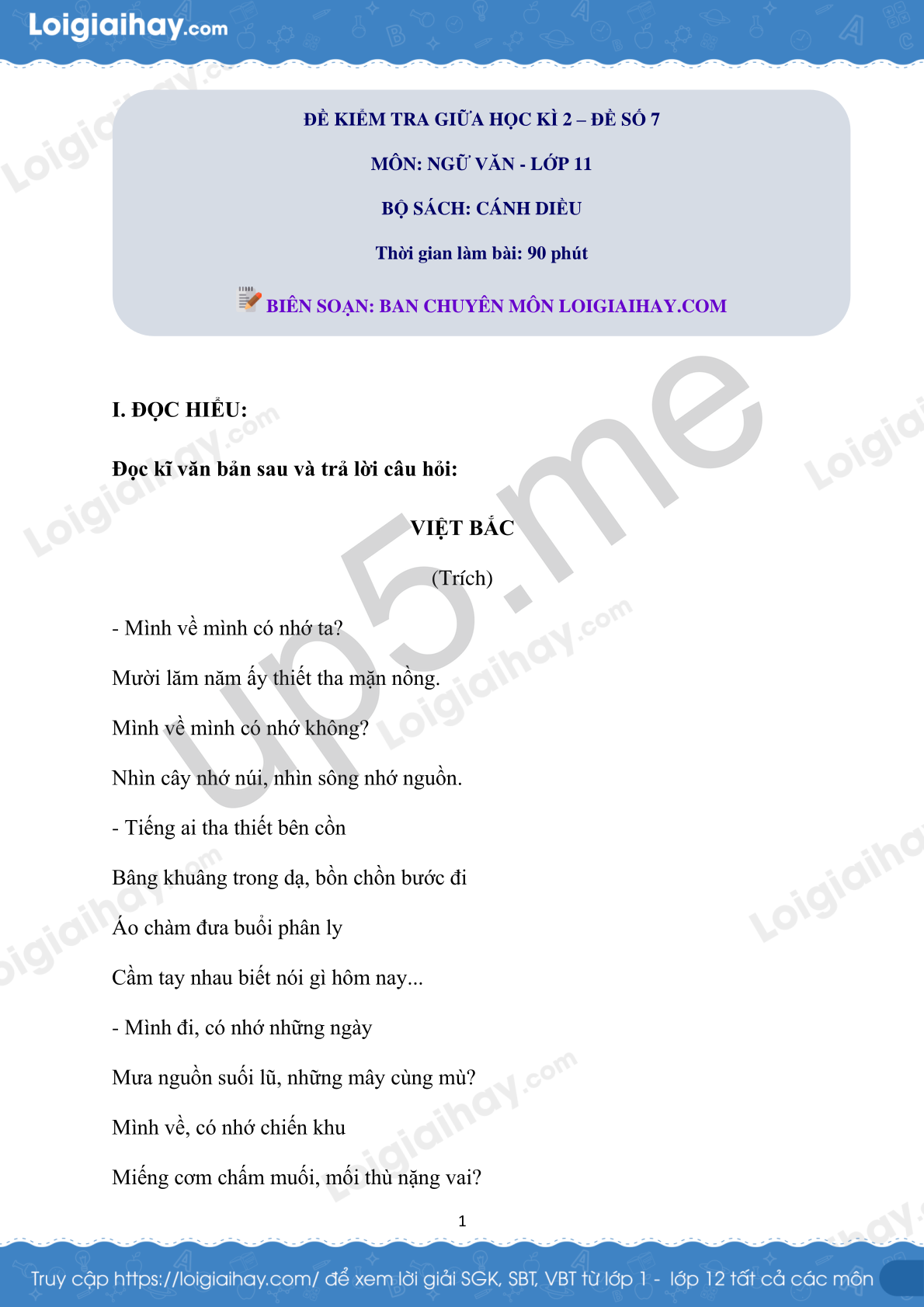 I. ĐỌC HIỂU: