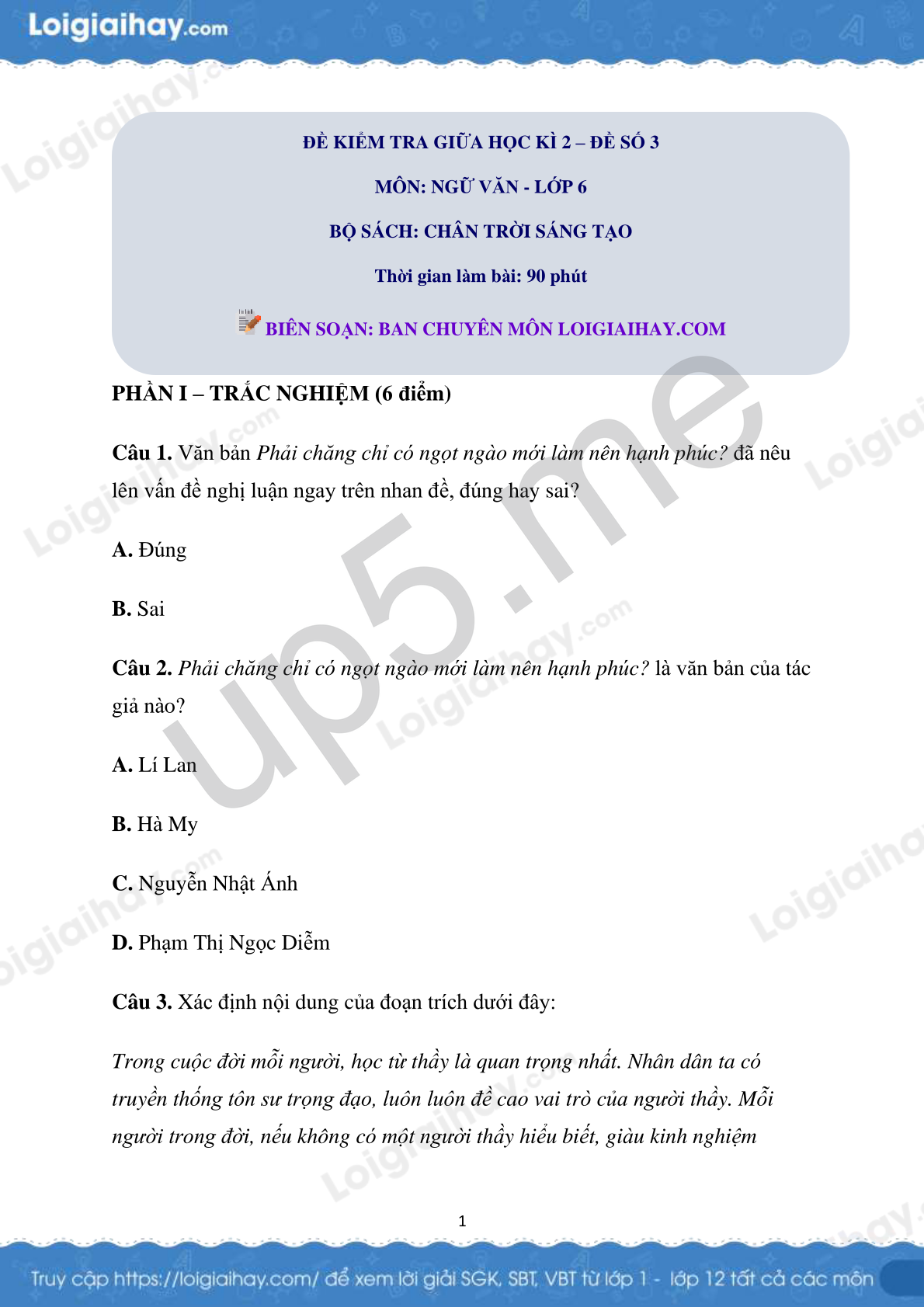 Câu 1. Văn bản Phải chăng chỉ có ngọt ngào mới làm nên hạnh phúc? đã nêu lên vấn đề nghị luận ngay trên nhan đề, đúng hay sai?