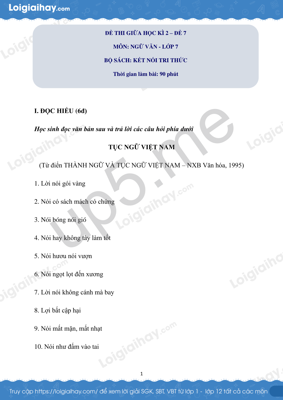 MÔN: NGỮ VĂN - LỚP 7