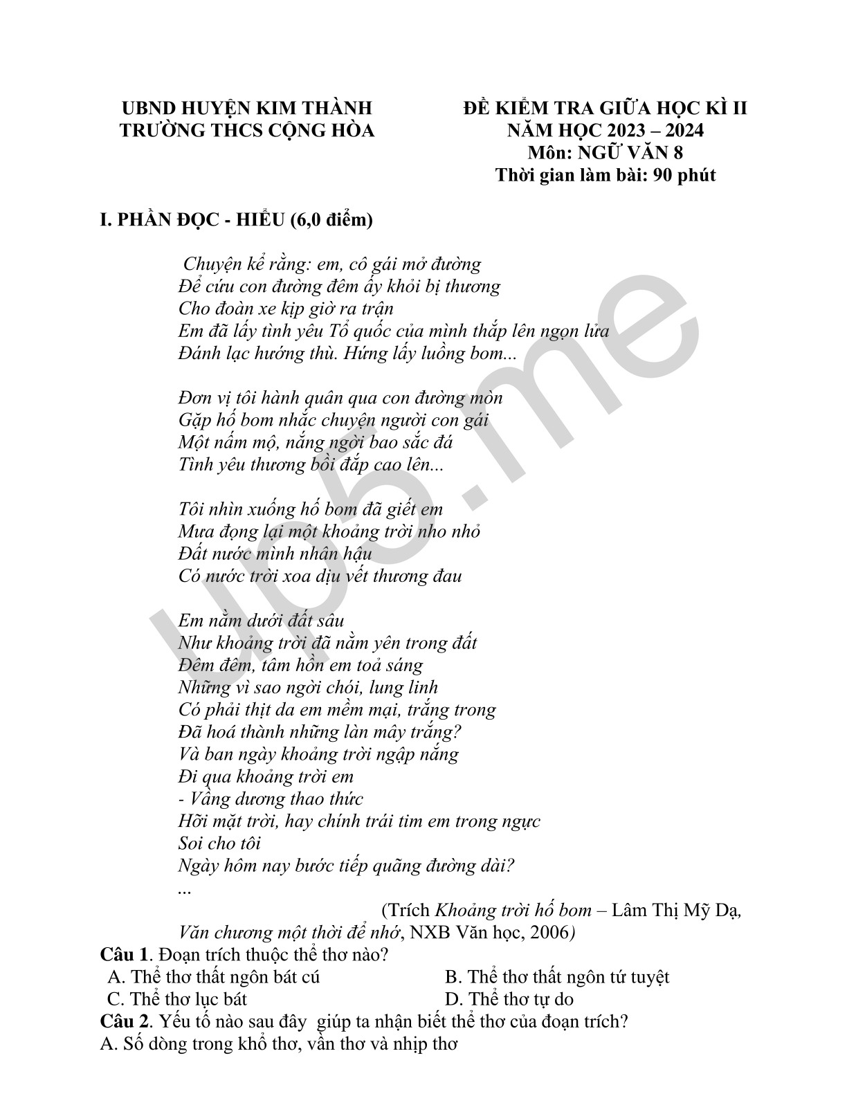 ĐỀ KIỂM TRA GIỮA HỌC KÌ II NĂM HỌC 2023 – 2024 Môn: NGỮ VĂN 8 Thời gian làm bài: 90 phút |