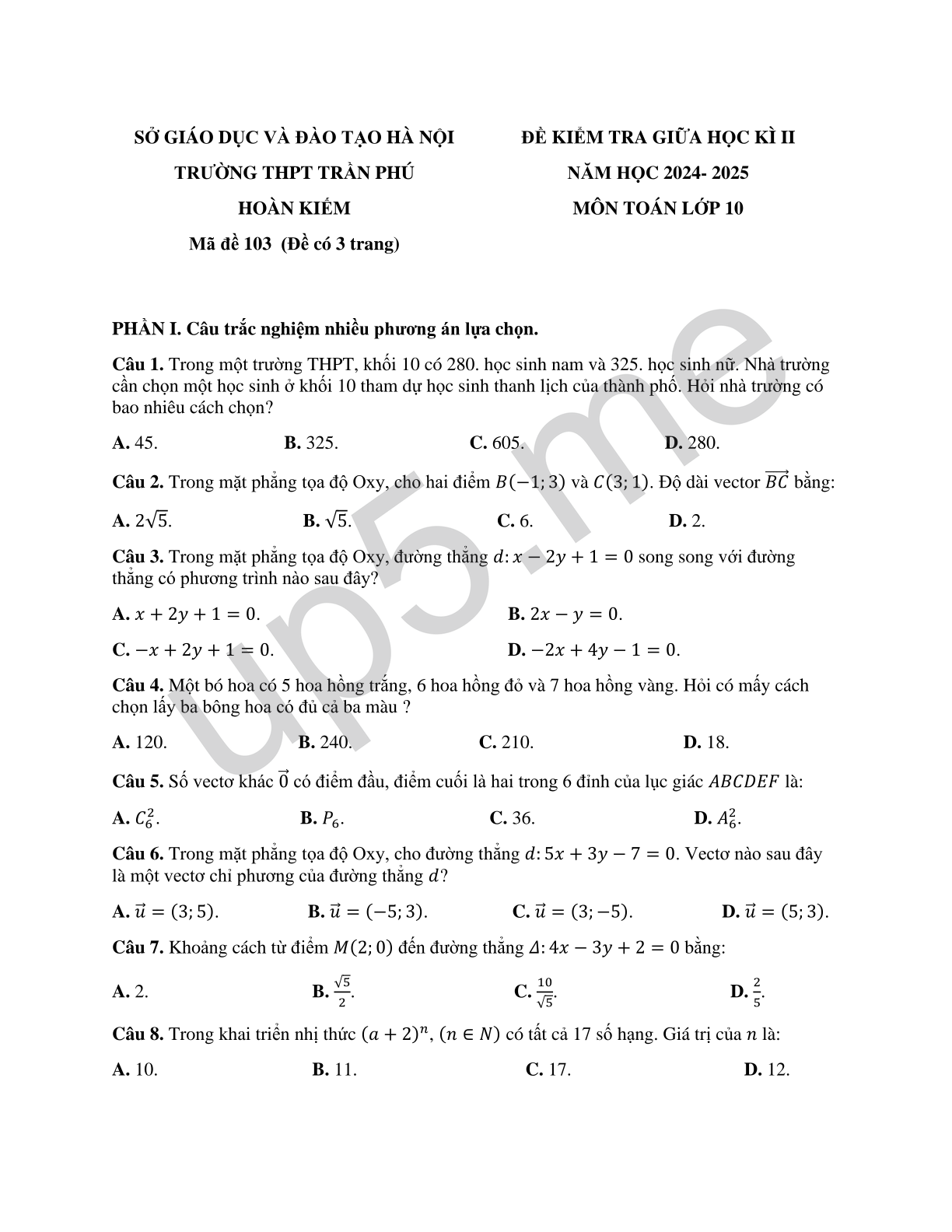| SỞ GIÁO DỤC VÀ ĐÀO TẠO HÀ NỘITRƯỜNG THPT TRẦN PHÚHOÀN KIẾMMã đề 103 (Đề có 3 trang) | ĐỀ KIỂM TRA GIỮA HỌC KÌ IINĂM HỌC 2024- 2025MÔN TOÁN LỚP 10 |
