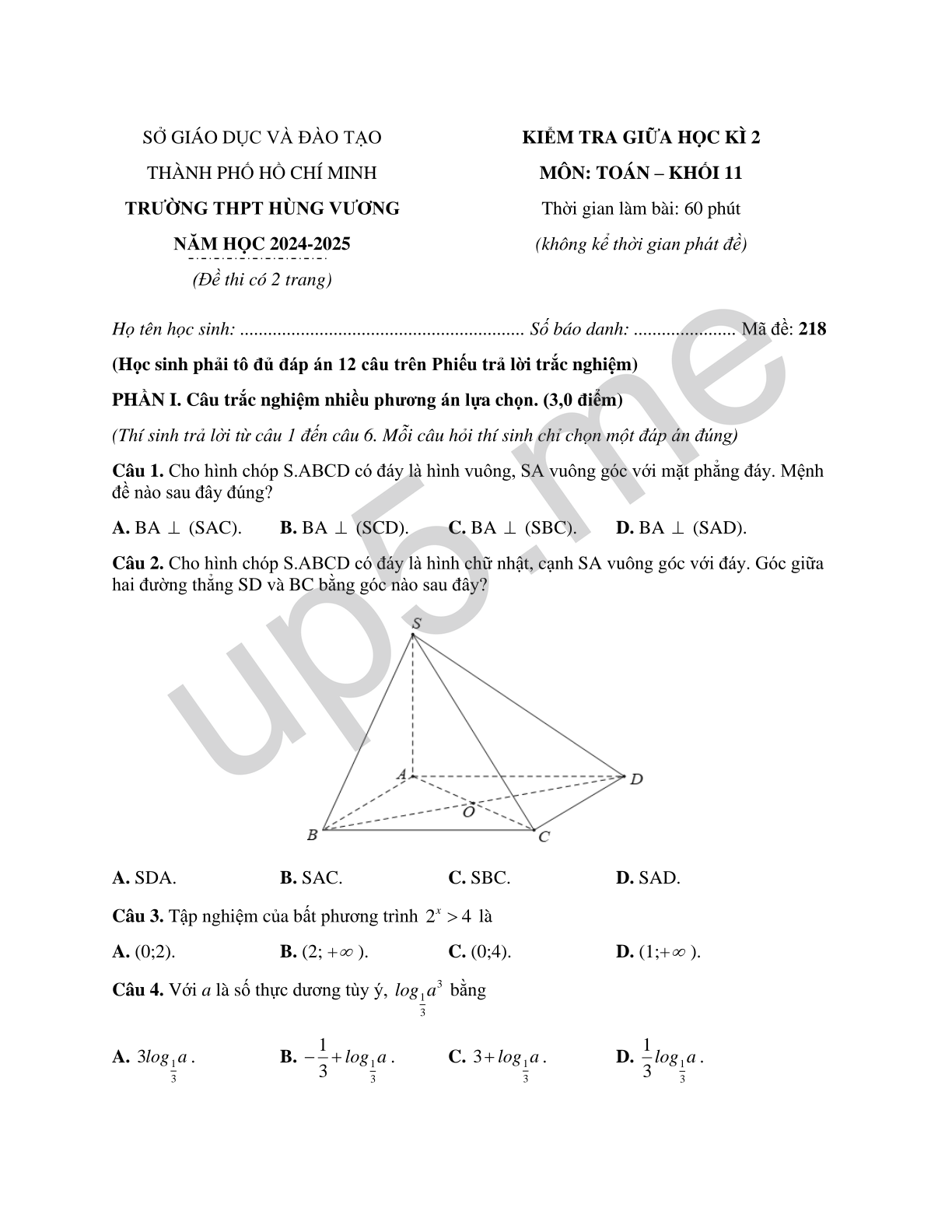 SỞ GIÁO DỤC VÀ ĐÀO TẠOTHÀNH PHỐ HỒ CHÍ MINHTRƯỜNG THPT HÙNG VƯƠNGNĂM HỌC 2024-2025(Đề thi có 2 trang) |
