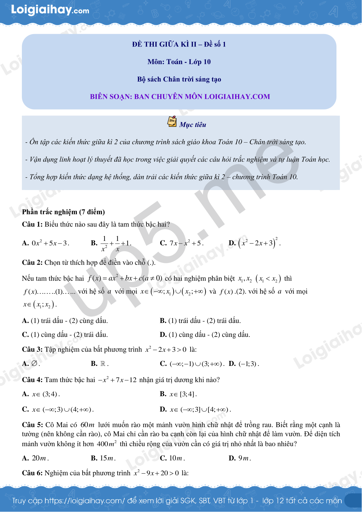 Mục tiêu- Ôn tập các kiến thức giữa kì 2 của chương trình sách giáo khoa Toán 10 – Chân trời sáng tạo.- Vận dụng linh hoạt lý thuyết đã học trong việc giải quyết các câu hỏi trắc nghiệm và tự luận Toán học.- Tổng hợp kiến thức dạng hệ thống, dàn trải các kiến thức giữa kì 2 – chương trình Toán 10. |