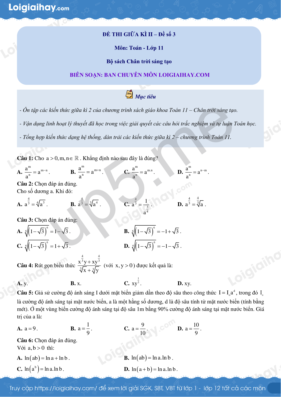 Mục tiêu- Ôn tập các kiến thức giữa kì 2 của chương trình sách giáo khoa Toán 11 – Chân trời sáng tạo.- Vận dụng linh hoạt lý thuyết đã học trong việc giải quyết các câu hỏi trắc nghiệm và tự luận Toán học.- Tổng hợp kiến thức dạng hệ thống, dàn trải các kiến thức giữa kì 2 – chương trình Toán 11. |