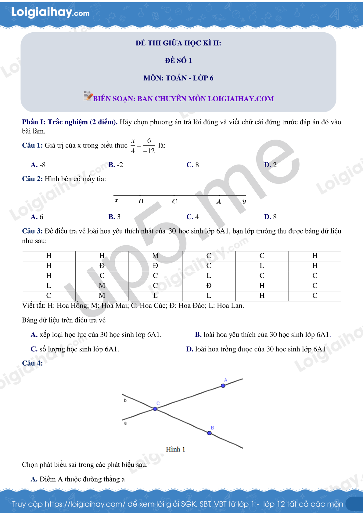 Câu 3: Để điều tra về loài hoa yêu thích nhất của 30 học sinh lớp 6A1, bạn lớp trưởng thu được bảng dữ liệu như sau: