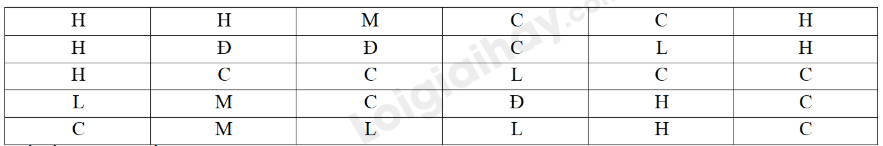 Viết tắt: H: Hoa Hồng; M: Hoa Mai; C: Hoa Cúc; Đ: Hoa Đào; L: Hoa Lan. Bảng dữ liệu trên điều tra về