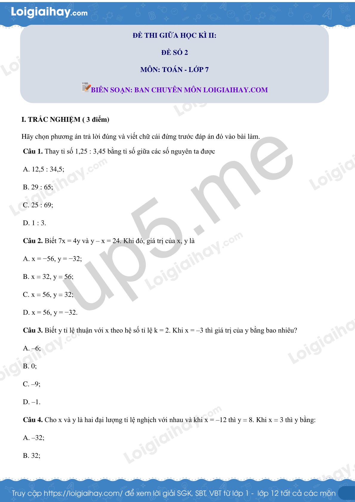 Câu 1. Thay tỉ số 1,25 : 3,45 bằng tỉ số giữa các số nguyên ta được