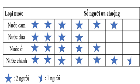 Câu 1: Một cửa hàng bán nước hoa quả đã khảo sát về các loại nước mà khách hàng ưa chuộng và thu được bảng dữ liệu sau: