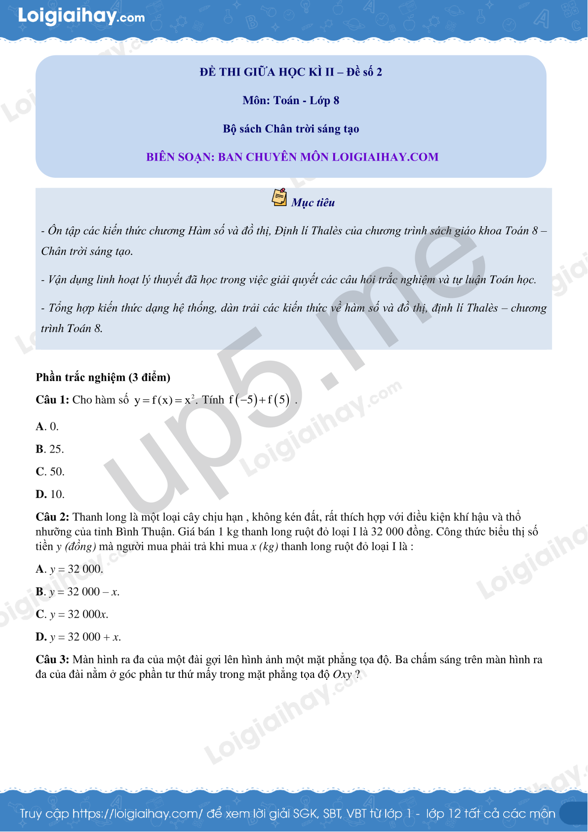 Mục tiêu- Ôn tập các kiến thức chương Hàm số và đồ thị, Định lí Thalès của chương trình sách giáo khoa Toán 8 – Chân trời sáng tạo.- Vận dụng linh hoạt lý thuyết đã học trong việc giải quyết các câu hỏi trắc nghiệm và tự luận Toán học.- Tổng hợp kiến thức dạng hệ thống, dàn trải các kiến thức về hàm số và đồ thị, định lí Thalès – chương trình Toán 8. |