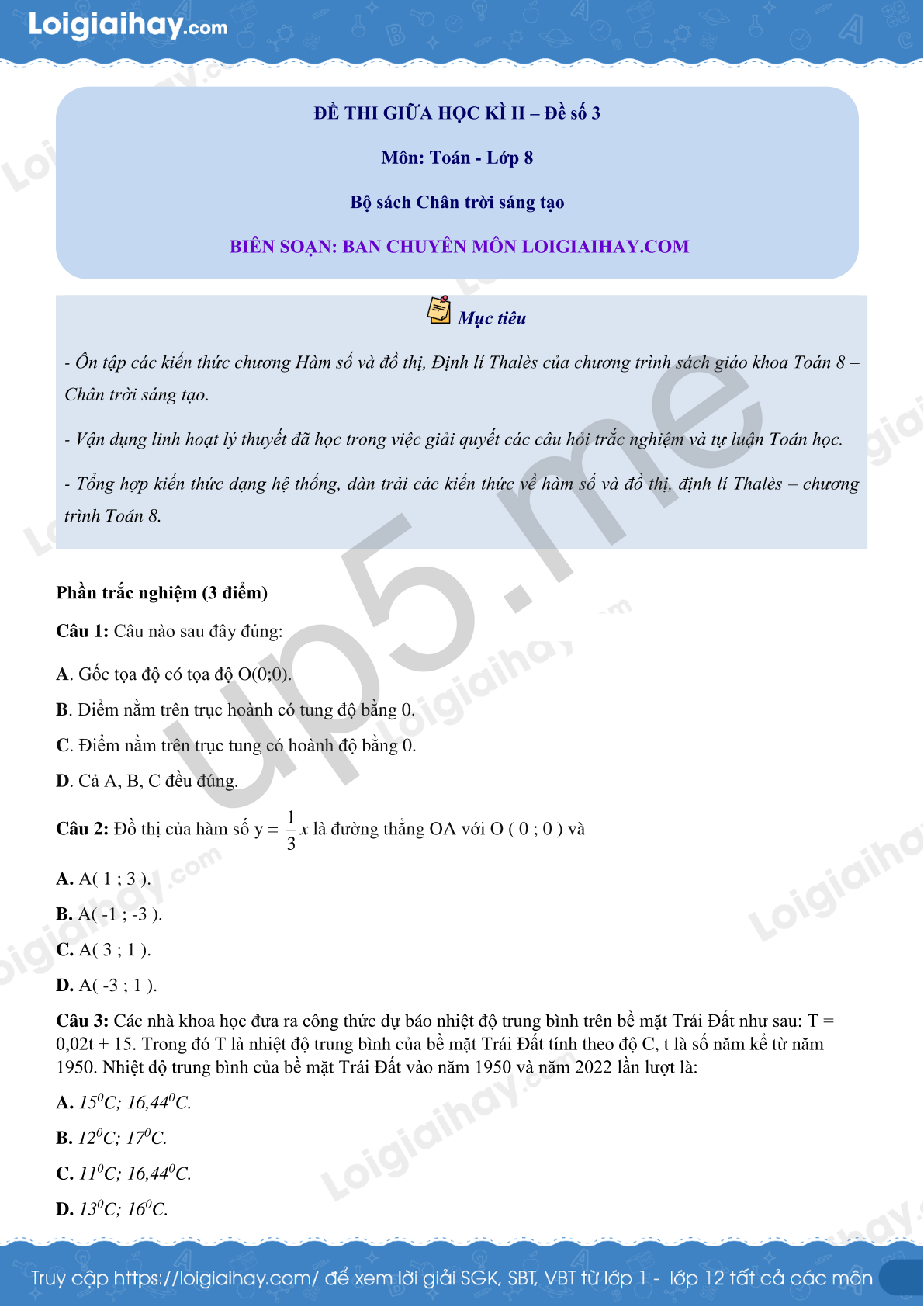 Mục tiêu- Ôn tập các kiến thức chương Hàm số và đồ thị, Định lí Thalès của chương trình sách giáo khoa Toán 8 – Chân trời sáng tạo.- Vận dụng linh hoạt lý thuyết đã học trong việc giải quyết các câu hỏi trắc nghiệm và tự luận Toán học.- Tổng hợp kiến thức dạng hệ thống, dàn trải các kiến thức về hàm số và đồ thị, định lí Thalès – chương trình Toán 8. |