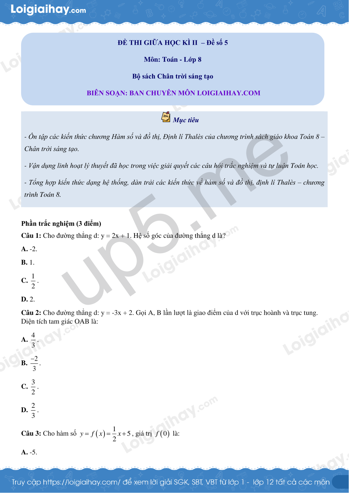 Mục tiêu- Ôn tập các kiến thức chương Hàm số và đồ thị, Định lí Thalès của chương trình sách giáo khoa Toán 8 – Chân trời sáng tạo.- Vận dụng linh hoạt lý thuyết đã học trong việc giải quyết các câu hỏi trắc nghiệm và tự luận Toán học.- Tổng hợp kiến thức dạng hệ thống, dàn trải các kiến thức về hàm số và đồ thị, định lí Thalès – chương trình Toán 8. |