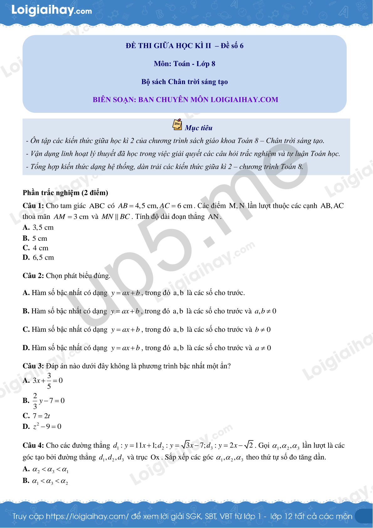 ĐỀ THI GIỮA HỌC KÌ II – Đề số 6