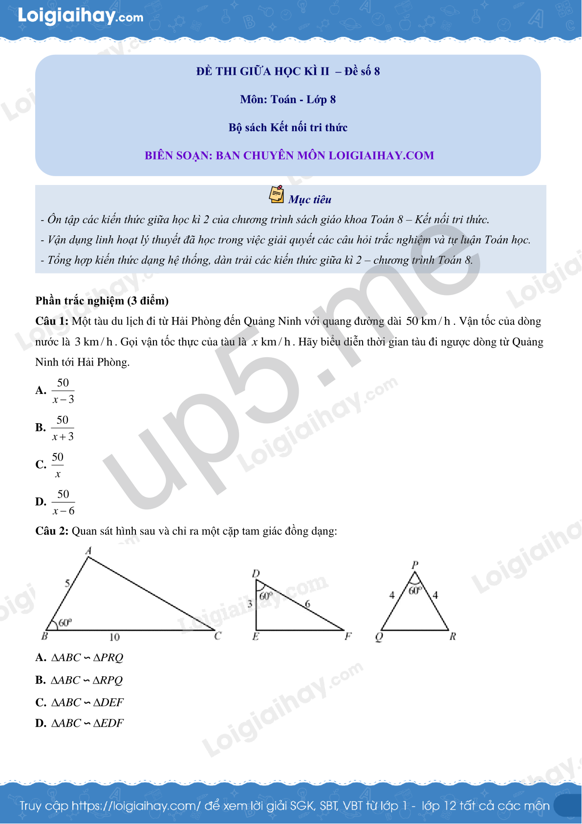 Mục tiêu- Ôn tập các kiến thức giữa học kì 2 của chương trình sách giáo khoa Toán 8 – Kết nối tri thức.- Vận dụng linh hoạt lý thuyết đã học trong việc giải quyết các câu hỏi trắc nghiệm và tự luận Toán học.- Tổng hợp kiến thức dạng hệ thống, dàn trải các kiến thức giữa kì 2 – chương trình Toán 8. |