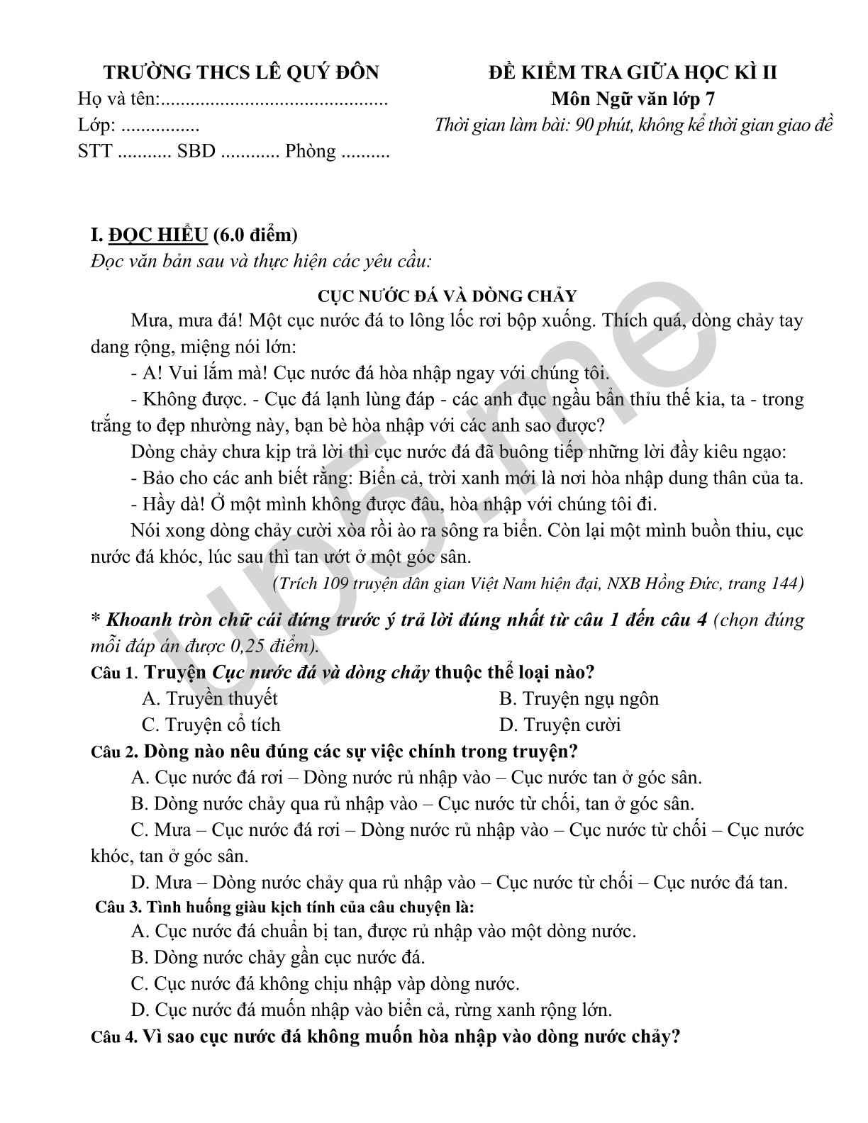 ĐỀ KIỂM TRA GIỮA HỌC KÌ II Môn Ngữ văn lớp 7 Thời gian làm bài: 90 phút, không kể thời gian giao đề |