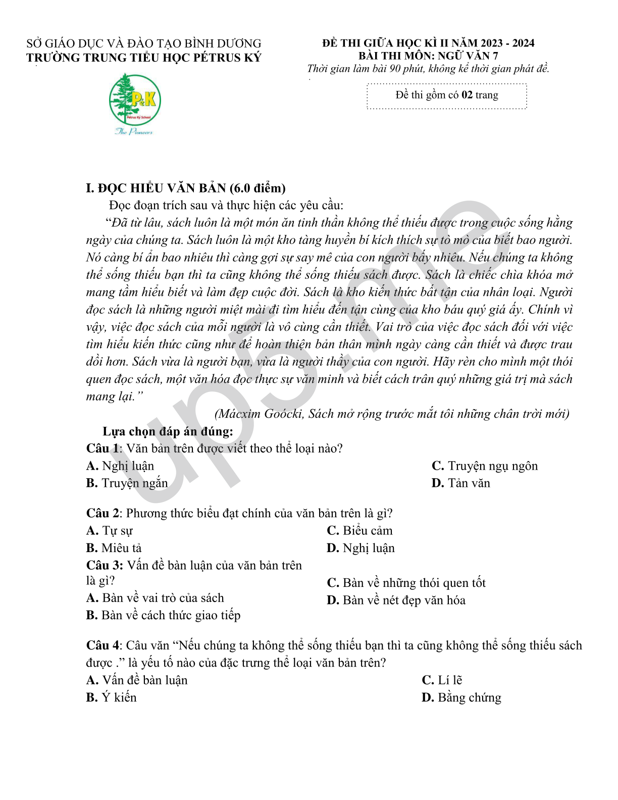 ĐỀ THI GIỮA HỌC KÌ II NĂM 2023 - 2024 BÀI THI MÔN: NGỮ VĂN 7 Thời gian làm bài 90 phút, không kể thời gian phát đề. |